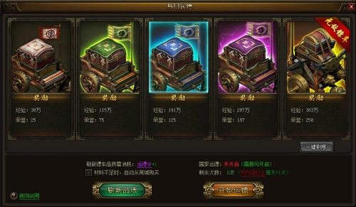 镖车品质分为5种,品质由低至高分别为白色,绿色,蓝色,紫色和橙色,品质越高奖励越高,玩家可以通过刷新镖车品质,选取合适的镖车。