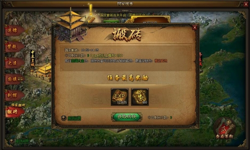 玩家等级到达120级后,每天可以在国家战事界面快速接取2次任务。任务需要玩家在规定时间内偷取敌国砖块,并且提交到本国太庙。同时敌国玩家也有隐藏的任务—保护太庙,敌国玩家击杀偷取本国砖块的玩家,将会完成任务并获得奖励。在王城守卫和玩家保护下,玩家偷取砖块只能智取不可强攻。