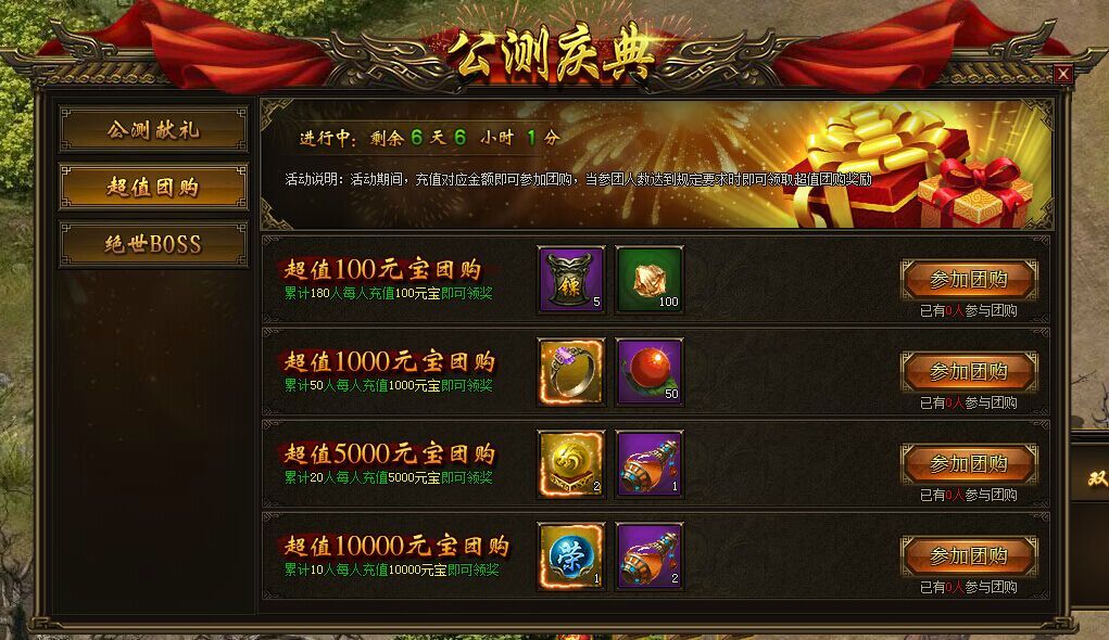 活动规则:活动期间,玩家只需充值相应金额,即可参加相应档次的团购活动;当每个档次的参团人数达到规定要求时即可领取超值团购奖励。