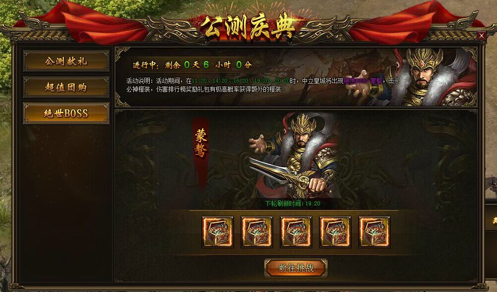 活动规则:活动期间,在11:20、14:20、16:20、19:20、20:20时,中立皇城将会出现绝世BOSS—蒙骜,击杀必掉橙色装备,同时对伤害排行榜上的玩家会有奖励礼包发放,礼包有极高概率开出额外的橙装!