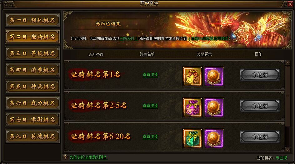 活动规则:开服第2天结束时,所有坐骑达到3阶及以上的玩家都可以获得200礼金,且坐骑排行前20名的玩家还可以获得额外的排名奖励!