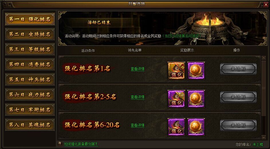 活动规则:开服第1天结束时,所有全身强化+3及以上的玩家都可以获得200礼金,且强化排行前20名的玩家还可以获得额外的排名奖励!