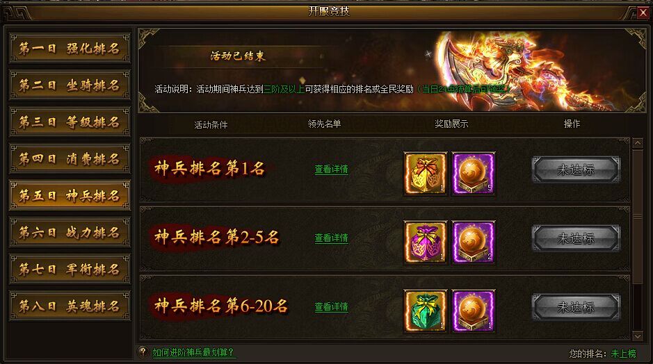 活动规则:开服第5天结束时,所有神兵达到3阶及以上的玩家都可以获得200礼金,且神兵排行前20名的玩家还可以获得额外的排名奖励!
