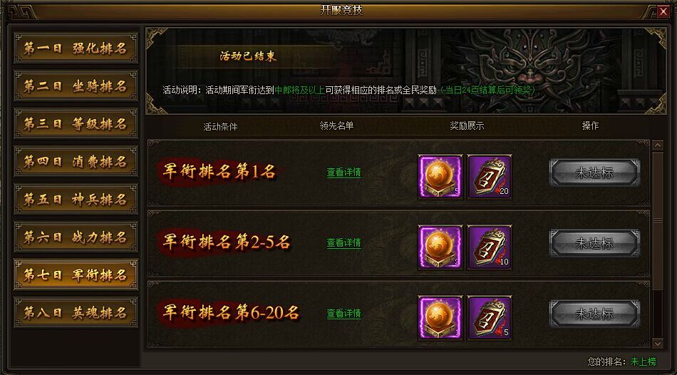 活动规则:开服第7天结束时,所有军衔达到中护将以上的玩家都可以获得200礼金,且军衔排行前20名的玩家还可以获得额外的排名奖励!