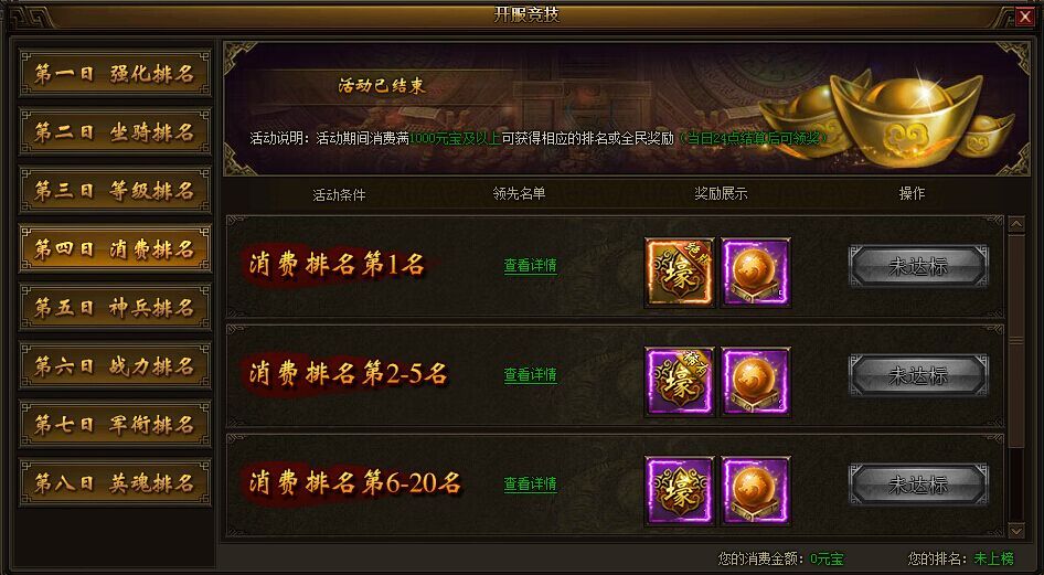 活动规则:开服第4天结束时,所有消费满1000元宝及以上的玩家都可以获得200礼金,且消费排行前20名的玩家还可以获得额外的排名奖励!