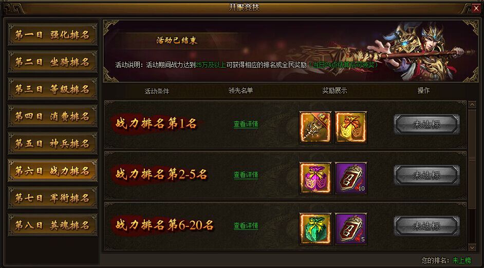 活动规则:开服第6天结束时,所有战力达到25万及以上的玩家都可以获得200礼金,且战力排行前20名的玩家还可以获得额外的排名奖励!
