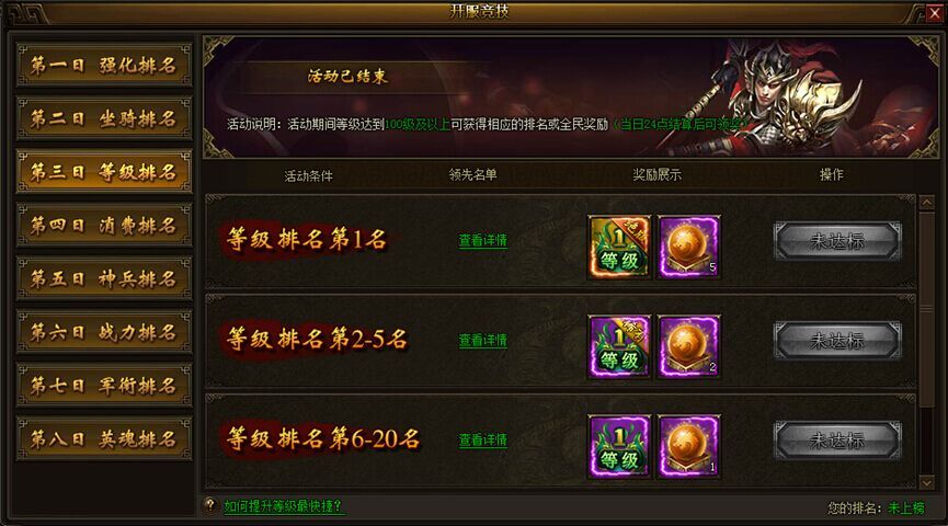 活动规则:开服第3天结束时,所有等级达到100级及以上的玩家都可以获得200礼金,且等级排行前20名的玩家还可以获得额外的排名奖励!